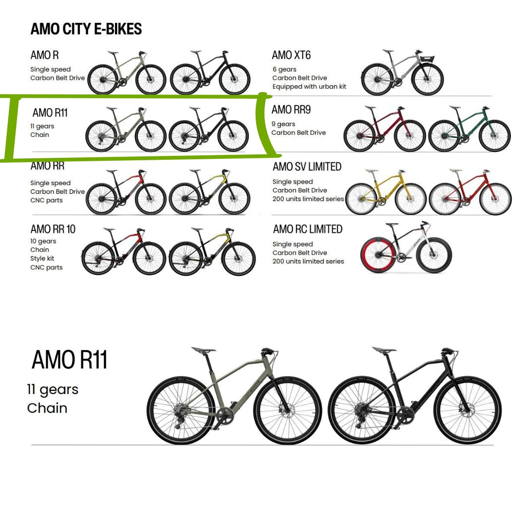 AMO R11 è una bici perfetta per la città, molto leggera e ottima per gestire anche le curve più difficili. AMO R11 ora viene fornito con il cambio SRAM 11 che ti consente di guidare anche in luoghi collinari con facilità. Una combinazione perfetta di stile e modernità.