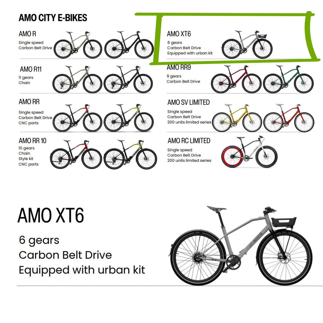 AMO XT6 è una city e-bike già completamente accessoriata con cestino, parafanghi, cavalletto e luci. Ideale per girare in città con il massimo comfort.