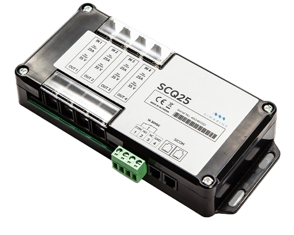 SCQ25 è un modulo shunt innovativo con quattro ingressi per il monitoraggio delle correnti continue di singoli apparecchi e caricabatterie fino a 25 A (35 A di picco) per ingresso su sistemi a 12 V e 24 V.