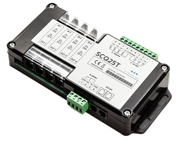 SCQ25T è un modulo shunt innovativo con quattro ingressi per il monitoraggio delle correnti continue di singoli apparecchi e caricabatterie fino a 25 A (35 A di picco) per ingresso su sistemi a 12 V e 24 V.